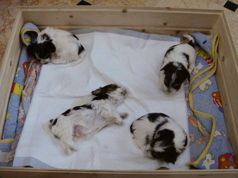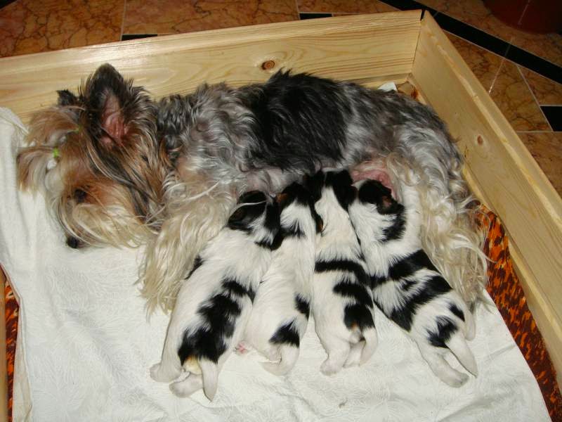 К сожалению время нельзя было заказать, поэтому примерно в 3 часа ночи меня разбудил громкий писк. Побродив по квартире, обнаружил что Джина расположилась в кладовой, где сборовила одеяло, лежавшее на полке и уже принесла первых двух щенков. Перенес и роженицу и детенышей в специально приготовленный короб с пеленками и установленный на теплом полу. Пока застирывал одеяло и пил чай, Джина принесла еще двух.